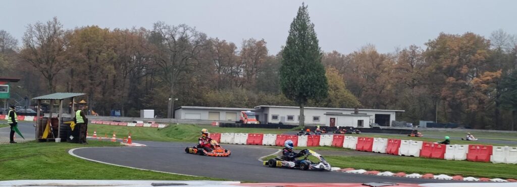Auf der durch die Test- und Einstellfahrten bekannten Strecke in Wittgenborn wurden die beiden letzten Rennen also die Läufe 15 und 16 ausgetragen. Bei 4° und Nebel setzte kurz vor dem ersten Rennen auch noch leichter Nieselregen ein. Die spontane Entscheidung, auf Regenreifen zu wechseln, erwies sich als goldrichtig. In ihren Klassen fuhren alle weiter nach vorne: Dominik 4.; Elissa 2.; Antonia 4.; Adrian 2., wobei seine Leistung besonders hoch zu bewerten ist, da ihm Gaststarter aus der WAKC (Westdeutschen ADAC Kart Cup) und die abtrocknende Strecke das Rennen erschwerten. Ein „kleiner Unfalldreher“ warf Dominik im zweiten Rennen etwas zurück, die anderen konnten ihre Platzierungen aus dem ersten Rennen verteidigen.